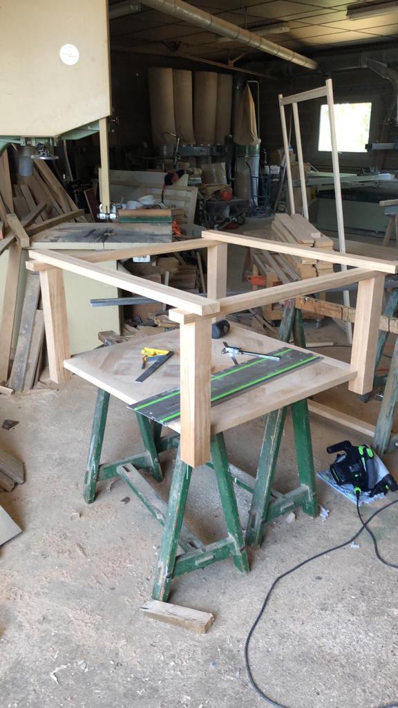 Une fois le tout ajusté et chevillé, me voilà lancé dans la fabrication de la table. J’ai choisi pour cela des assemblages tenons-mortaises pour la ceinture supérieure, moins complexes qu’un assemblage clé du barbu avec lequel j’ai d’abord hésité.