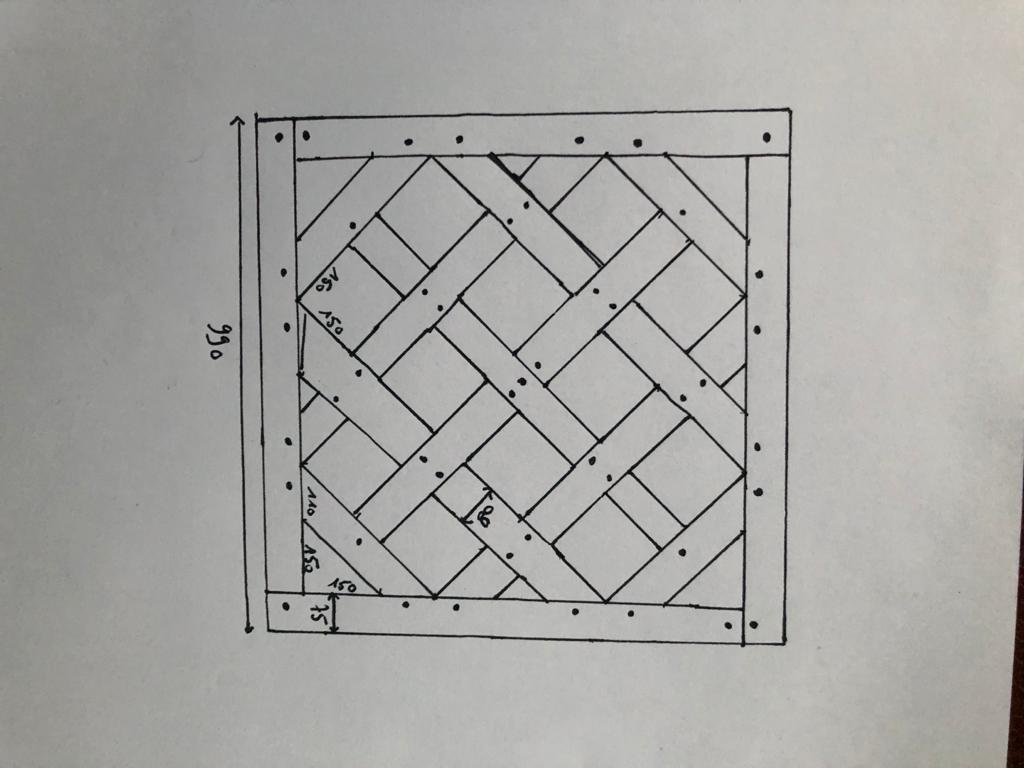 Pour réaliser le croquis à leur proposer, je me suis inspiré d’un salon qui avait un parquet Versailles. J’ai réduit les proportions de 20% ; les dalles de parquet Versailles faisant traditionnellement 1 mètre de côté. Une fois ce croquis validé par notre jeune couple, vient l’élaboration de l’épure, c’est-à-dire le dessin du projet à taille réelle. Cette étape est très importante, l’épure me servira en effet tout au long de la création du meuble : il me suffira simplement de poser une pièce dessus pour vérifier si elle est conforme ou non.